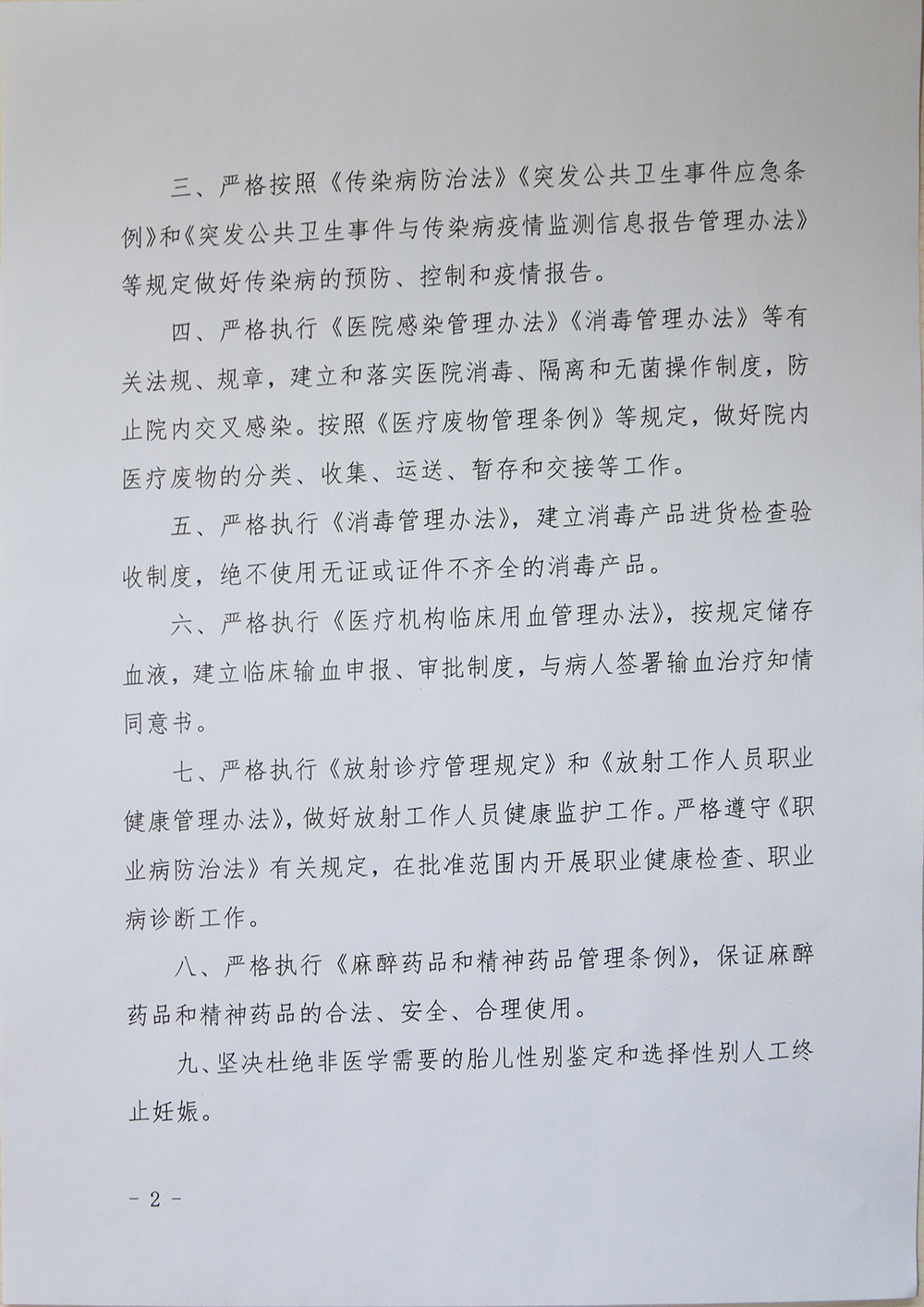 一、遵纪守法,恪守医德,严格遵守《执业医师法》《传染病防治法》《精神卫生法》《中医药法》《母婴保健法》《医疗机构管理条例》《医疗废物管理条例》《医疗质量管理办法》等法律、法规和医疗技术规范,依法执业。对社会和公众负责,保证医疗质量,接受社会监督,承担社会责任。