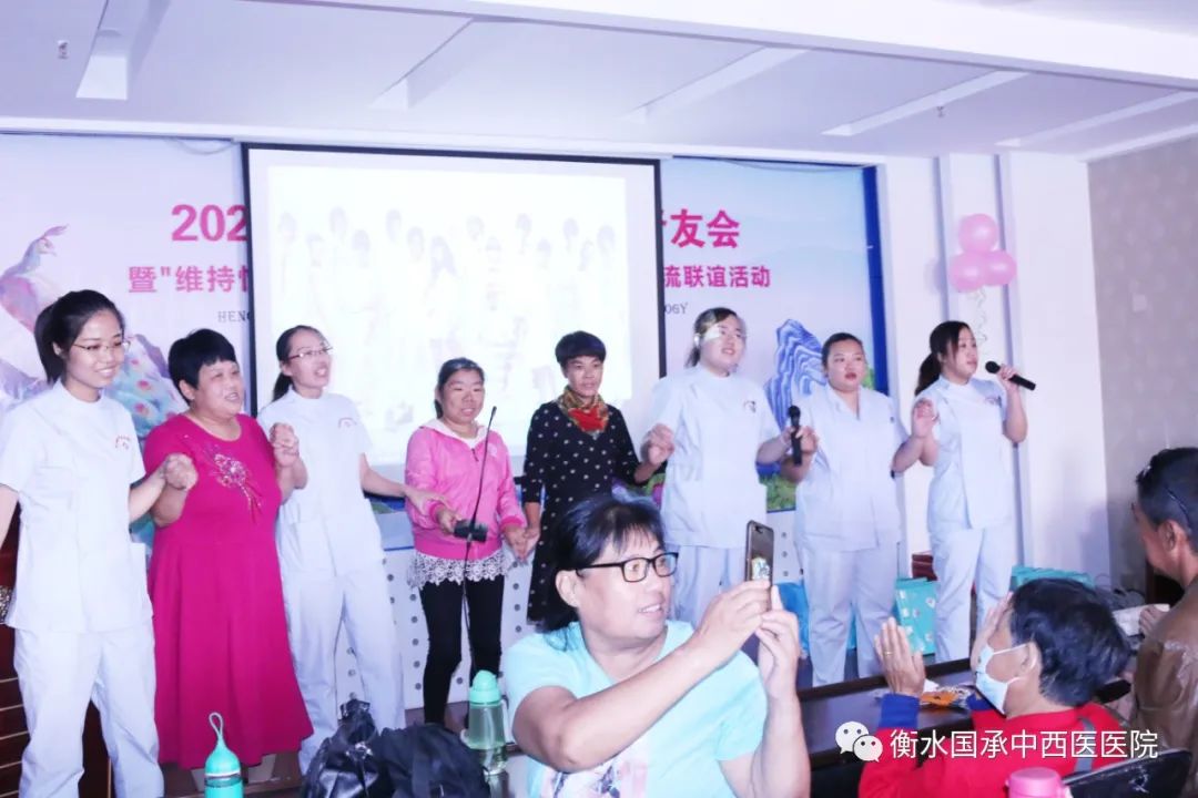 在娱乐互动环节,透析科医护与多位肾友走上舞台真情演唱了《朋友》、《我的万水千山》、《为了谁》、《相亲相爱一家人》等歌曲,高潮迭起,欢声笑语,现场一片温馨快乐的节日气氛。