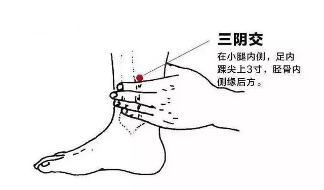 在我们内踝的骨头尖上面大概四横指,在胫骨的一个前缘位置,分别是脾经、肝经和肾经相交会的一个穴位 。